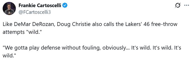 不光是德罗赞,国王的主教练克里斯蒂也急眼了,赛后采访他的美国记者现场就表示:“克里斯蒂说湖人队全队得到46次罚球,太夸张了,这简直是离谱,这是一个很疯狂同时也很不可思议的数据。”